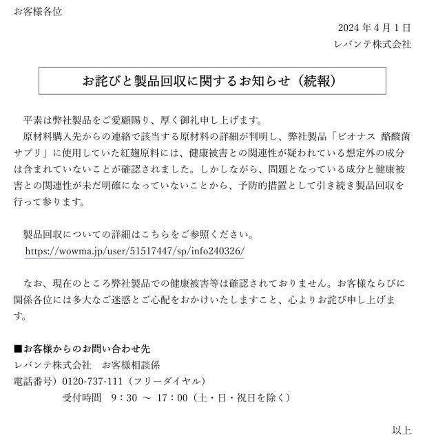 【ビオナス 酪酸菌サプリ】に関するお詫びと製品回収のお知らせ(続報)