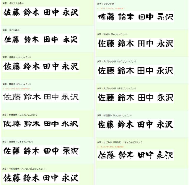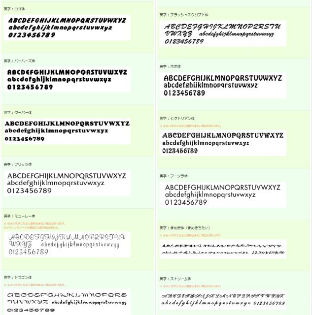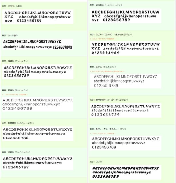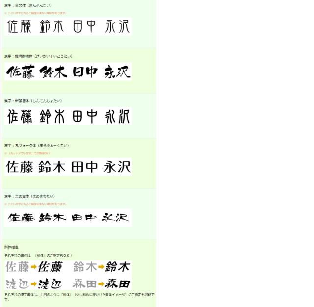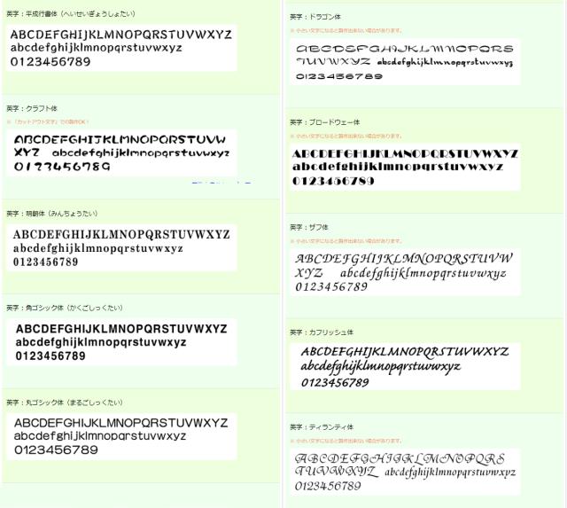各商品は一番似合う書体でサンプルを作ってありますが、 別の書体で作成したい場合は以下の書体一覧よりお選びいただき、 商品ページの選択メニューにてご希望の書体をお知らせください。
