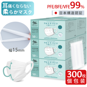 | 個包装マスク 耳にやさしい幅広耳紐タイプの個包装マスク ウルトラワイド50枚入:サイズ175mm× 90mm(耳紐幅15mm) |