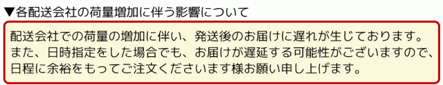 ※休業明けはご注文が集中し商品ページ記載の出荷予定日内に出荷が出来ない場合もございます。何卒ご了承いただきますよう、お願い申し上げます。