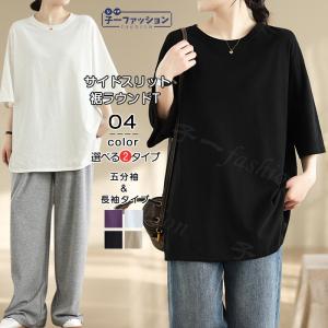 <1点2,650円!クーポン利用で>Tシャツ サイドスリット裾ラウンドTシャツ クルーネック 五分袖 長袖 冬新作 新作 無地 トップス レディ