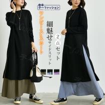 ロングワンピース ワンピース 冬新作 2点セット 上下セット サイドスリットtシャツ ロング丈 長袖 レディース カジュアル ゆったり シン