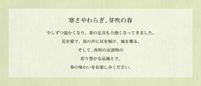 ご家庭用 西利のお漬物を試してみたいという方におすすめ。 少量、食べ切りサイズでお届けします。 |