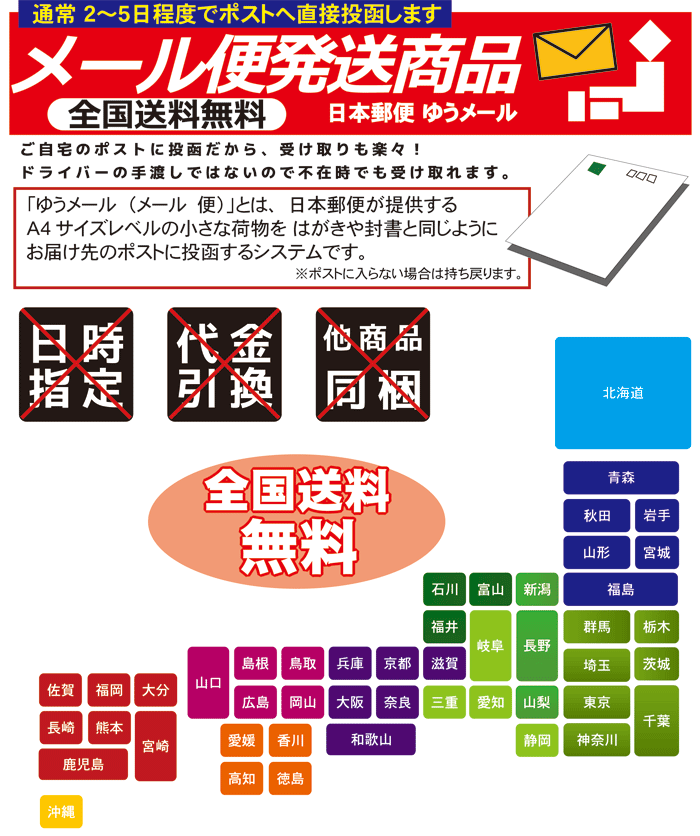 日本郵便 ゆうメールにてお届けします 葉書や封書のように、お届け先のポストに投函して配送が完了する配送方法です。 荷物を手渡しでお届けする宅配便とは異なります。 荷物を受け取るために在宅の必要もなく、小さな荷物の受け取りに便利です。 |
