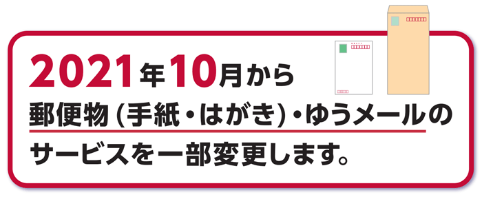 お客さまにおかれましては、申し訳ございませんが、ご理解の程よろしくお願い申し上げます。 土曜日配達の休止(2021年10月2日(土)〜) 普通扱いとする郵便物・ゆうメール※について、土曜日配達を休止します。 特定記録とするものも含みます。 お届け日数の繰り下げ(2021年10月以降段階的に実施) 普通扱いとする郵便物・ゆうメール※について、お届け日数を1日程度繰り下げます。 実施時期などの詳細は日本郵便株式会社Webサイトでお知らせします。 ※普通扱いとする郵便物・ゆうメールとは、書留や速達などのオプションサービス(特殊取扱)を付加しないもののことをいいます。 |
