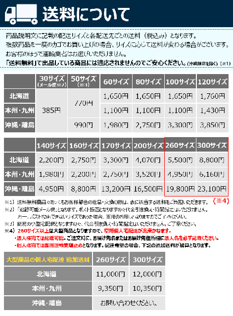 ※複数商品を1度の買い物かごで購入いただいた場合、配送サイズが大きくなり、商品ページの表示とは別の運送会社で発送させていただく場合がありますのでご了承ください。