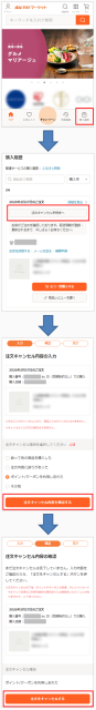 トップページの「購入履歴」> 該当注文の「注文キャンセル手続きへ」> キャンセル理由を選択し「注文キャンセル内容を確認する」 > 「注文をキャンセルする」