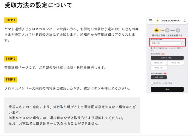 ・クロネコメンバーズなら荷物の受け取り方法として、玄関ドア前や宅配ボックスなどの置き配が選択いただけます。