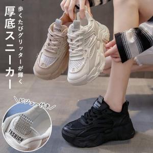 厚底 スニーカー ダッドシューズ レディース 靴 ローカット カジュアル シンプル レースアップ ビジュー キラキラ ラメ 黒 白 (送料無料)