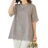 ブラウス 半袖 麻混 サマー レディース 綿麻生地シャンブレーレース使いオーバーブラウス グレー マオカラー 裾レース 婦人服 ミセス シ