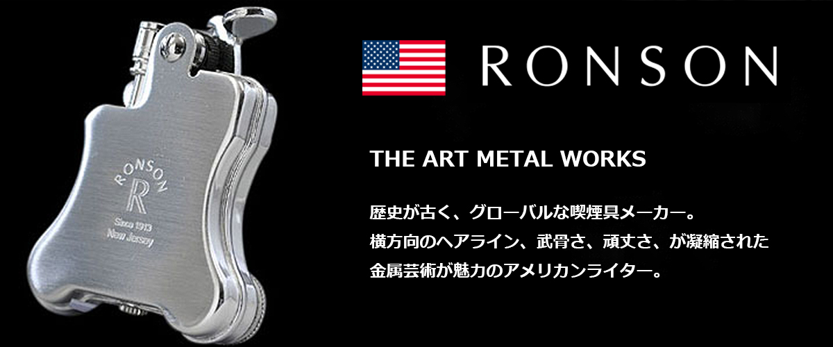 流線形のボディが印象的なRonson社のフラッグシップモデル「バラ・フレーム(Varaflame)」、世界初の全自動ワンタッチ式ライター「バンジョー(Banjo)」、1943年以来アメリカでベストセラーを続ける「スタンダード(Standard)」、次々と生みだす新機構、斬新なデザイン、アメリカンクラフトマンが生みだす品質と耐久性。その社名が示す芸術的なメタルワークスの世界。 炎とメタルの融合が芸術的なレベルまで高められた価値あるブランドです。