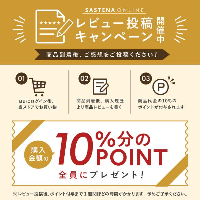 | 当ストアでは、お買い物されたお客様からのレビューを今後の店舗運営、商品開発に活かしていきたいと考えております。 そこで、商品到着後に「商品レビュー」や「店舗レビュー」を書いていただいたお客様全員に、感謝の気持ちとして商品代金の「10%分のポイント」をプレゼントさせていただきます。 ※ポイント付与されるまでに1週間程度のお時間をいただいております。何卒ご了承ください。 |
