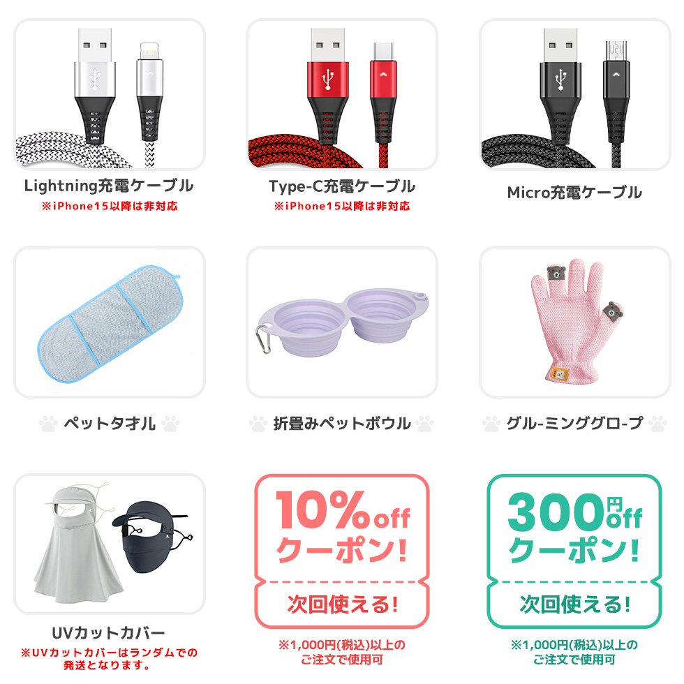 実際に商品を利用いただいたお客様からの情報は、これからお買い物をされる方や ショップの品質向上にとても役に立つ貴重な情報となります。 今なら商品到着後レビューを書いてメールするだけでプレゼントをGET! ■ 商品プレゼント: - iPhone充電ケーブル - Type-c充電ケーブル - micro充電ケーブル - UVカットカバー - ペットタオル - グルーミンググローブ - 折畳みペットボウル ■ クーポンプレゼント: -【次回使える】300円OFFクーポン -【次回使える】10%OFFクーポン 皆様からの投稿を心よりお待ちしております! ■ プレゼント商品はこちら