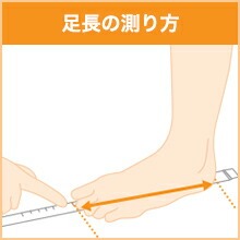 かかとを目盛りの0位置に合わせ、定規・またはメジャーを動かないようにしっかり固定します。足指の一番長いところを計測します。