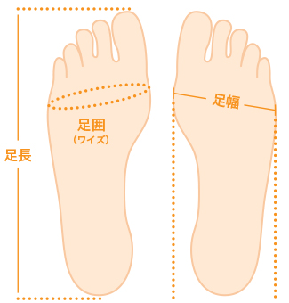 また、年齢や体重等により、足囲が変わることもありますので、一度だけでなく、サイズやワイズの変化を時々確かめる必要もあります。また足のサイズは個人の差がございます。左右の足でも大きさが異なることが多く、軸足の方が少し大きい場合が多くあります。サイズを選ぶ際には大きい方の足を基準にお考えください。