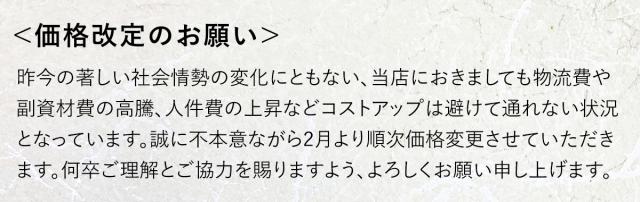 昨年9月から病気療養させていただいていましたが、お陰様で日常生活ができるようになりました。少しずつですが、 営業を再開し仕事復帰をさせていただきます。お休みの間、多くの励ましのお言葉をいただきありがとうございました。 今後も皆様に良い商品をお届け出来ように、精進していきたいと思います。今後ともよろしくお願いいたします。