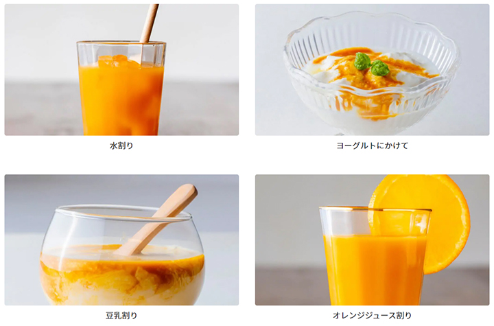 水や炭酸で割ってさっぱり飲みやすくしたり、牛乳や豆乳で割ってまろやかにしたり。お好きなジュースに混ぜてもおいしくお召し上がりいただけます。