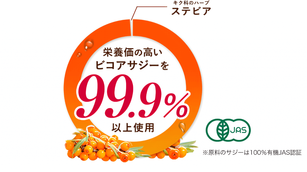 豊潤サジーは100%植物由来にこだわり、99.9%以上のサジー果実と、0.1%未満のステビア(キク科)だけでつくりました。