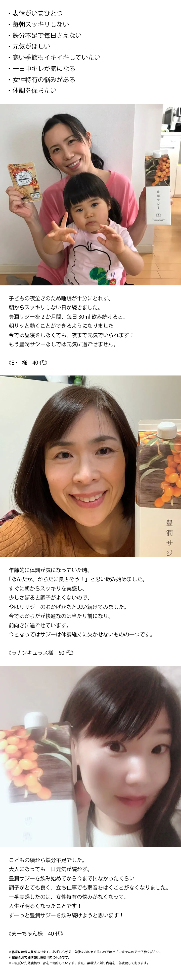 豊潤サジーの良さをお感じになったお客様より、さまざまな体験談をいただいておりますが、体感には個人差がございます。気長にお付き合いいただければ幸いです♪