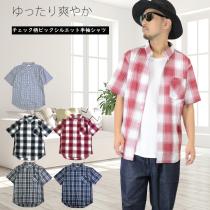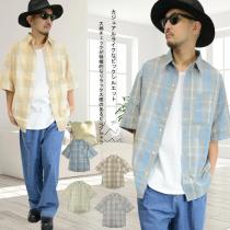 【閉店セール】半袖シャツ チェック柄 ビックシルエットバンドカラー 35383 メンズシャツ シャツ ビッグシャツ M L LL ビックシルエット