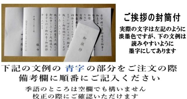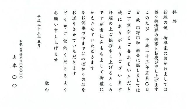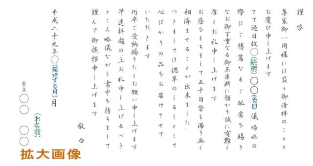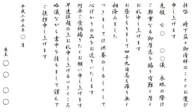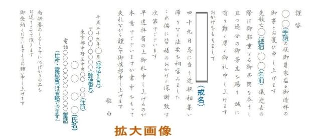 ↑葬儀のお返しを金額に応じて 四十九日後に発送する場合の文例です |
