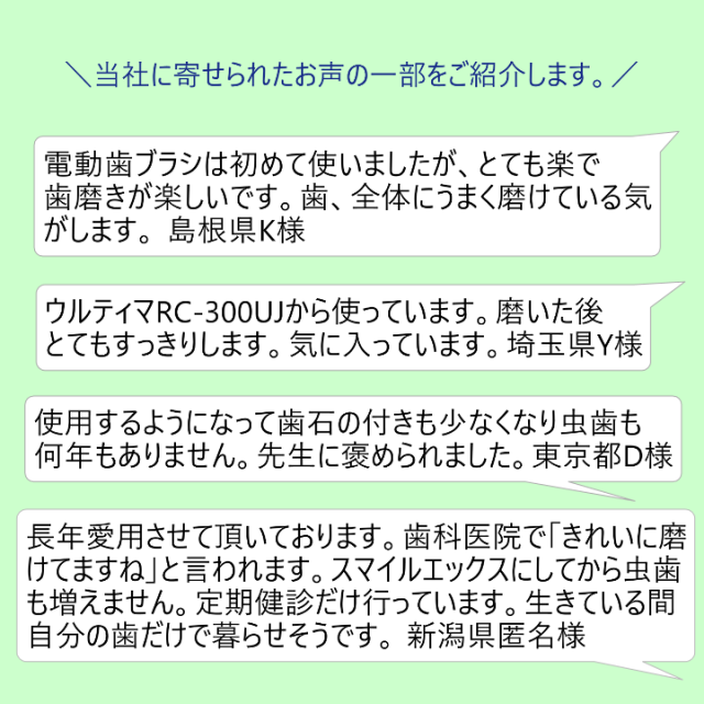 私たちはこれまで「東レ・ウルティマ」シリーズをはじめ、数多くの超音波歯ブラシを開発・製造してまいりました。 その経験と技術をすべて注ぎ込んだのが、自社ブランド「スマイルエックス」です。 メーカー直営店として、商品の発送からアフターケアまで、私たちが直接責任を持って対応いたします。専門メーカーならではの品質とサービスを、ぜひご体感ください。 |