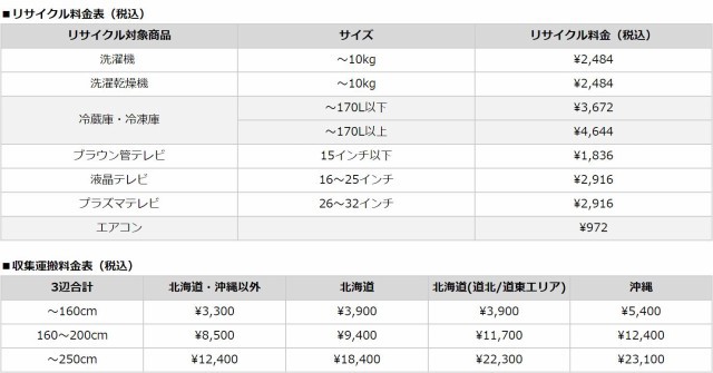 エアコン、ブラウン管式テレビ、薄型テレビ(液晶、プラズマ)、冷蔵庫・冷凍庫、洗濯機・衣類乾燥機について、 特定家庭用機器再商品化法(家電リサイクル法)で定められた家電リサイクル料金と、運搬料(お客様実費負担)が発生致します。