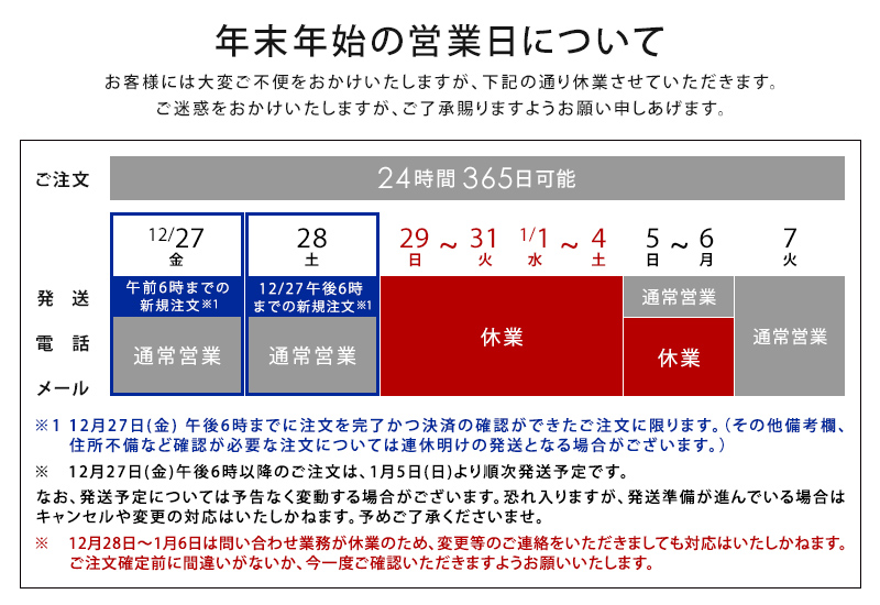 12月26日(金)18:00以降のお問い合わせについては、1月5日(月)午前9時より順次対応いたします。
