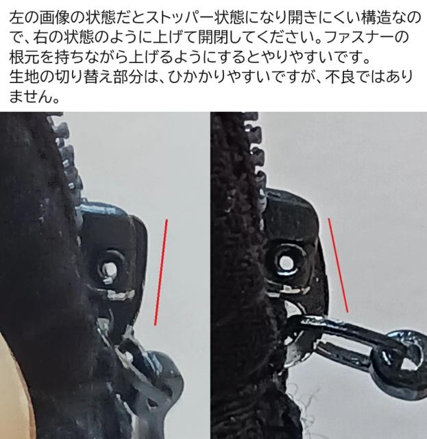 ・ファスナーは入念に検品するようしていますが、日本のように頑丈でもなく壊れやすく悪いです。基本的に、自然に落ちていかないように、以下の画像の構造になっていて、ひかかったりしますのでこれについての返品はしません。開かない場合は、生地を噛んでいることもよくあるので、確認してみることもオススメします。