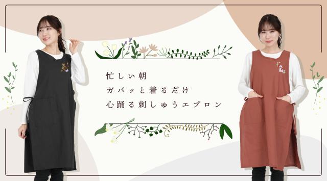 ガバッと!刺繍エプロン 春風と遊ぶわんこ ワンポイント刺繍 おしゃれ かわいい レディース かぶるだけ マホガニーブラウン 撥水 コット