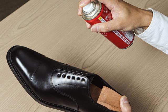 仕上げに水分、油分、汚れなどのダメージから靴を守る撥水スプレーを靴全体に均等にスプレーします。