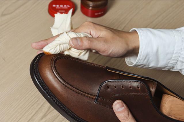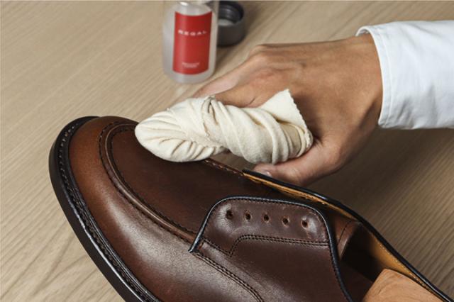 お手入れ専用クロスTY36に取ってから靴に塗る事でシミや塗りムラを防ぎます。