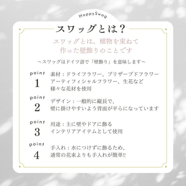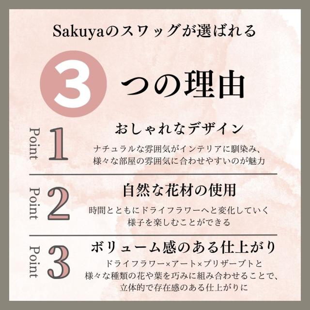 スワッグは、ドライフラワーや保存加工された花材を使用しているため、長期間その美しさを保ちます。季節や時間の経過とともに少しずつ変化していく姿も、また魅力の一つです。