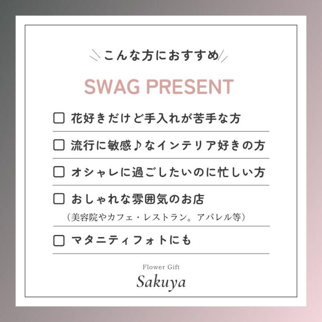 スワッグは幅広い年齢層に喜ばれるギフトです。特別なお手入れが不要なので、贈る側も受け取る側も気軽に楽しめます。