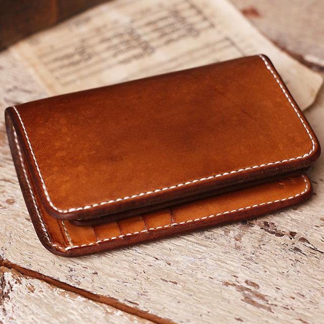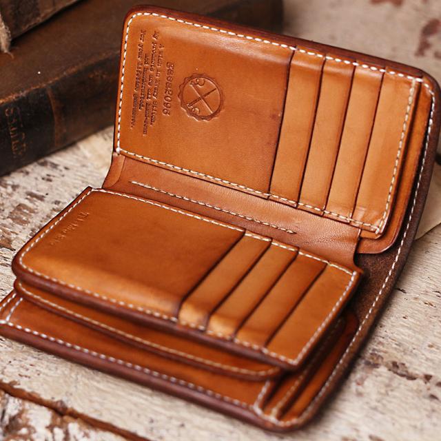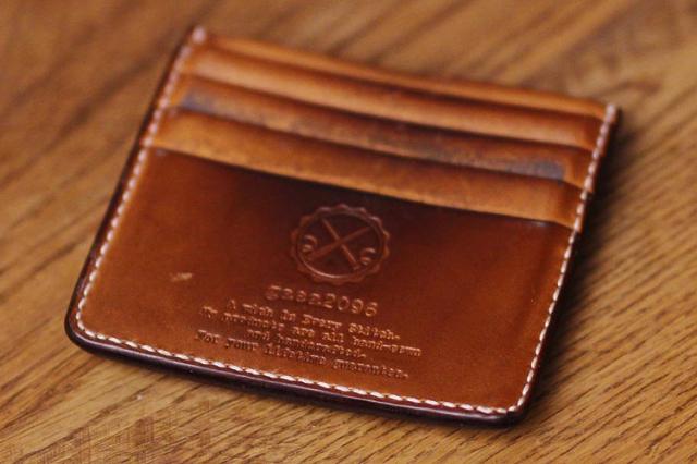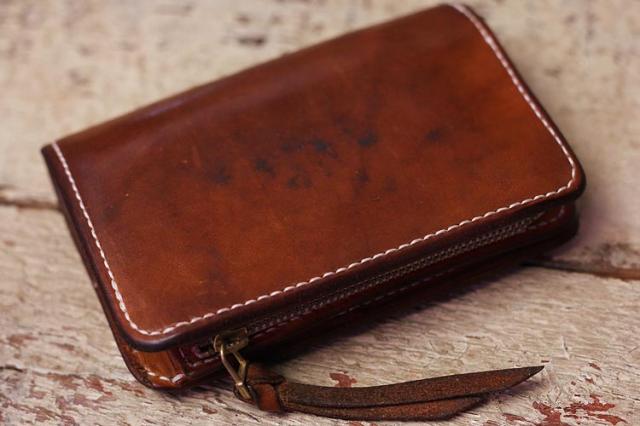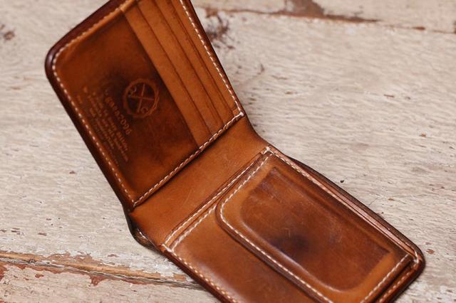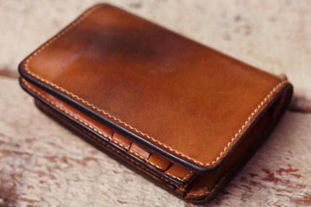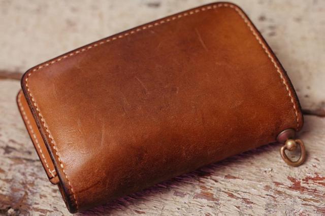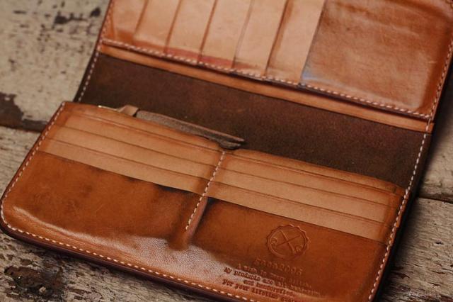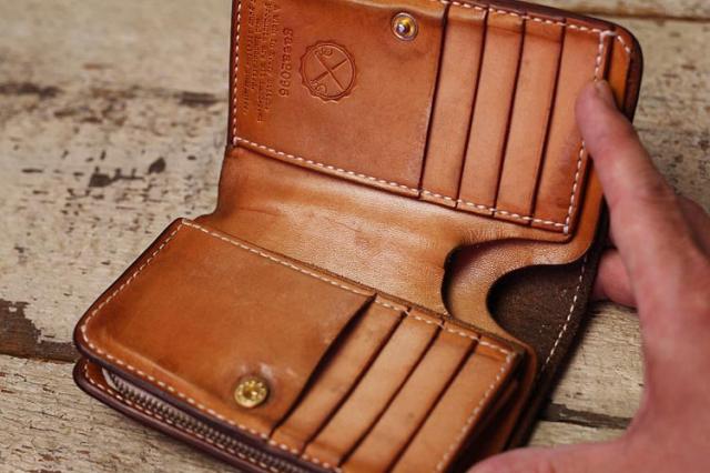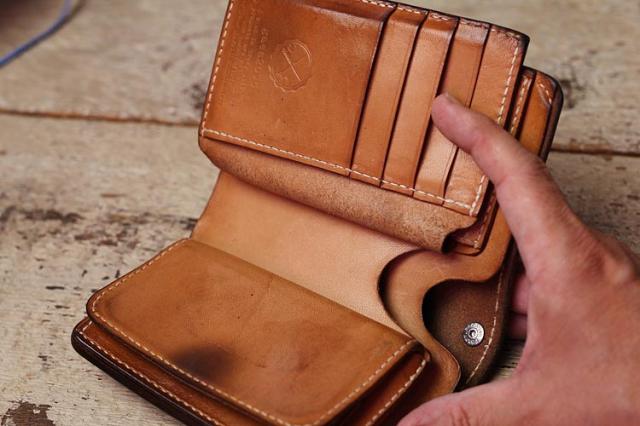 9年ほどご愛用のミドル財布、ボックス小銭入れ&追加カード入れ。こちらのお客さんは、カードも含めて中身を出した状態でオイルメンテナンスを毎月やられているみたいで、外側内側含めて(ロゴ刻印周りを見るとすごくよくわかりますが)ものすごく均一な経年変化になっています!!素晴らしい〜!!